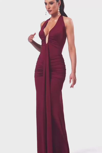Amica Ruched Halter Maxi Dress – Deep Wine Elegance