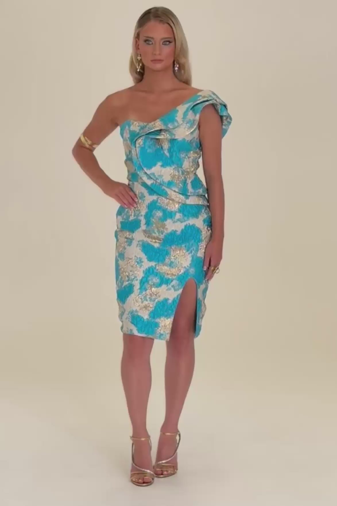 Caterina One-Shoulder Jacquard Mini Dress – Turquoise & Gold
