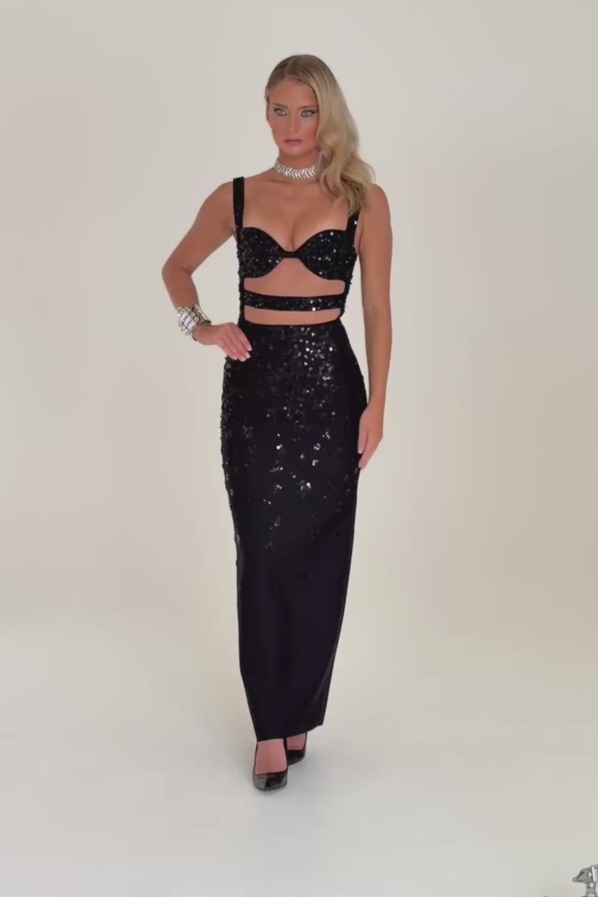 Turn heads in the Kylie Cutout Diamante Maxi Dress, a show-stopping black evening gown designed for after-dark glamour. This formal maxi dress features a structured, sequin-embellished bodice with bold cutout detailing that highlights the waist, creating a sleek, sculpted silhouette. Subtle sparkle throughout the fabric catches the light effortlessly, while the floor-length skirt elongates the frame for an ultra-elegant finish.
